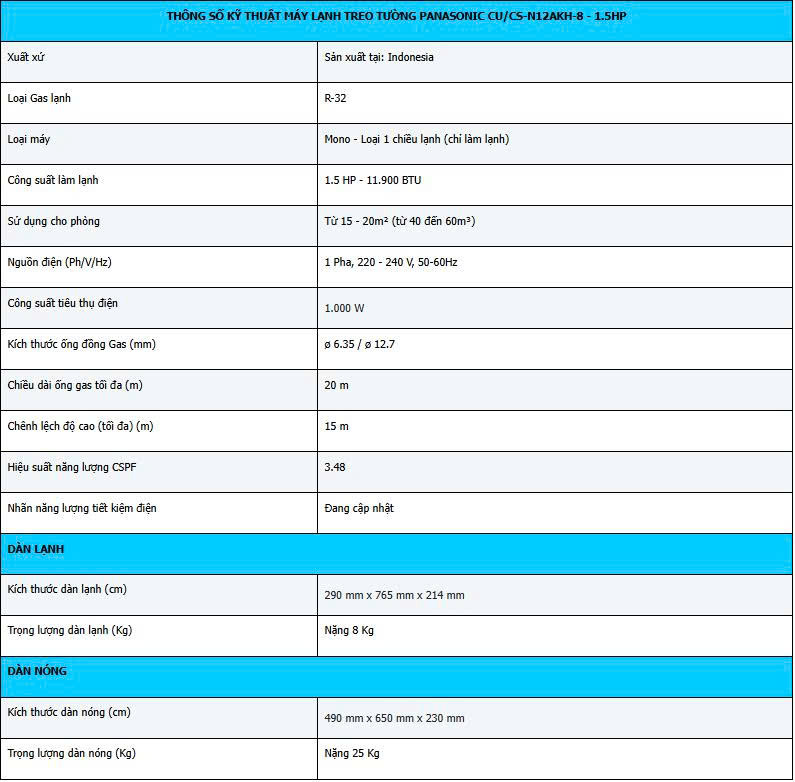 - Máy lạnh treo tường PANASONIC CU/CS-N12AKH-8 11.700Btu
