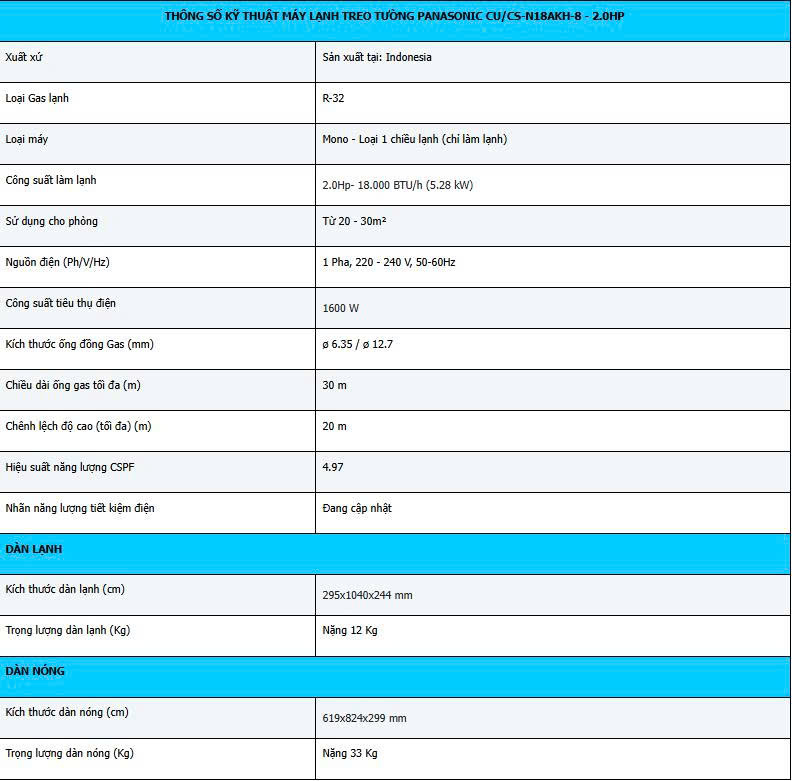 - Máy lạnh treo tường PANASONIC CU/CS-N18AKH-8 18.000Btu