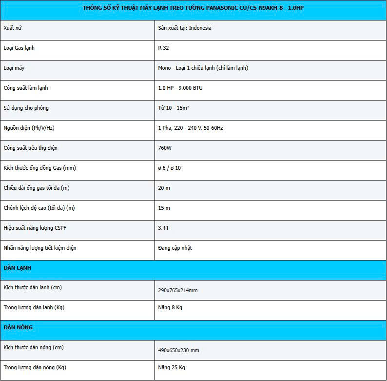 - Máy lạnh treo tường PANASONIC CU/CS-N9AKH-8 9.040Btu